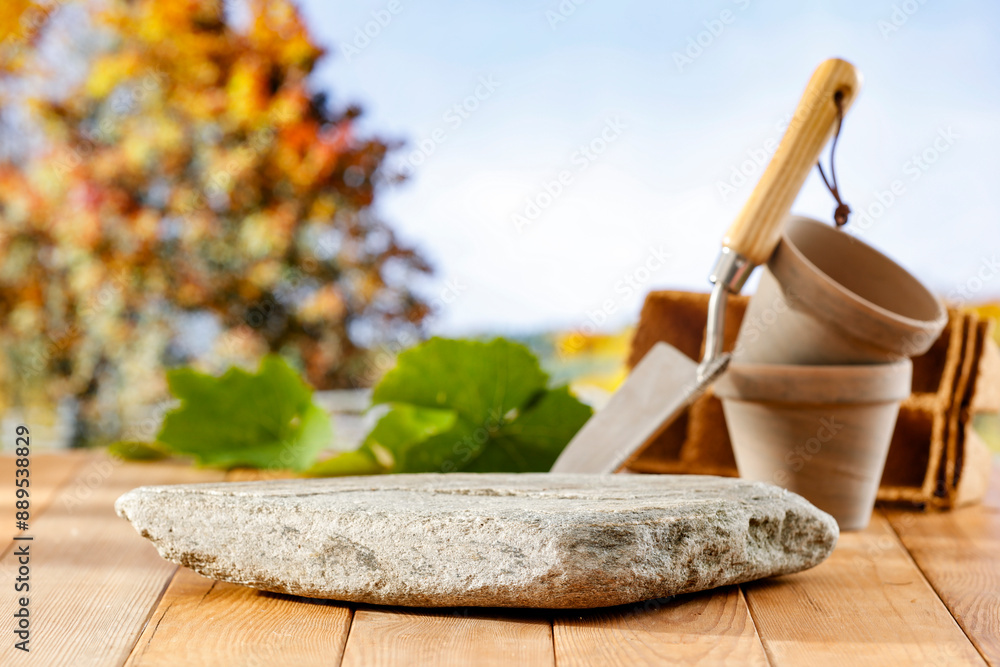 Autumn garden concept and copy space on wooden garden table top. Seedling and flowerpots and some garden tools background.