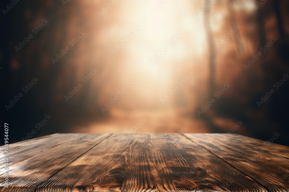 Forest in autumn time background. Empty wooden table with copy space for products.
