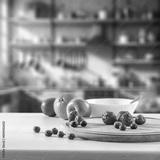 Blurred kitchen interior and fresh fruit on wooden cutting board on white countertop and space for food and drink and products and objects.