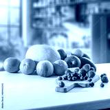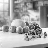 Blurred kitchen interior and fresh fruit on wooden cutting board on white countertop and space for food and drink and products and objects.
