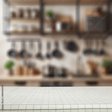 Blurred kitchen background and empty wooden table with copy space for products amd montage objects display.