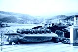 Wooden garden table and grilled sausages and vegetables in summer time concept and copy space for food and products.