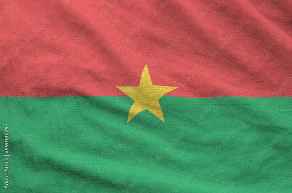 Burkina Faso flag depicted on folded wavy fabric of old cloth close up