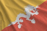 Bhutan flag depicted on folded wavy fabric of old cloth close up