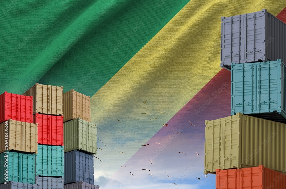 Congo flag and big stack of shipping cargo containers in docks with sky background close up