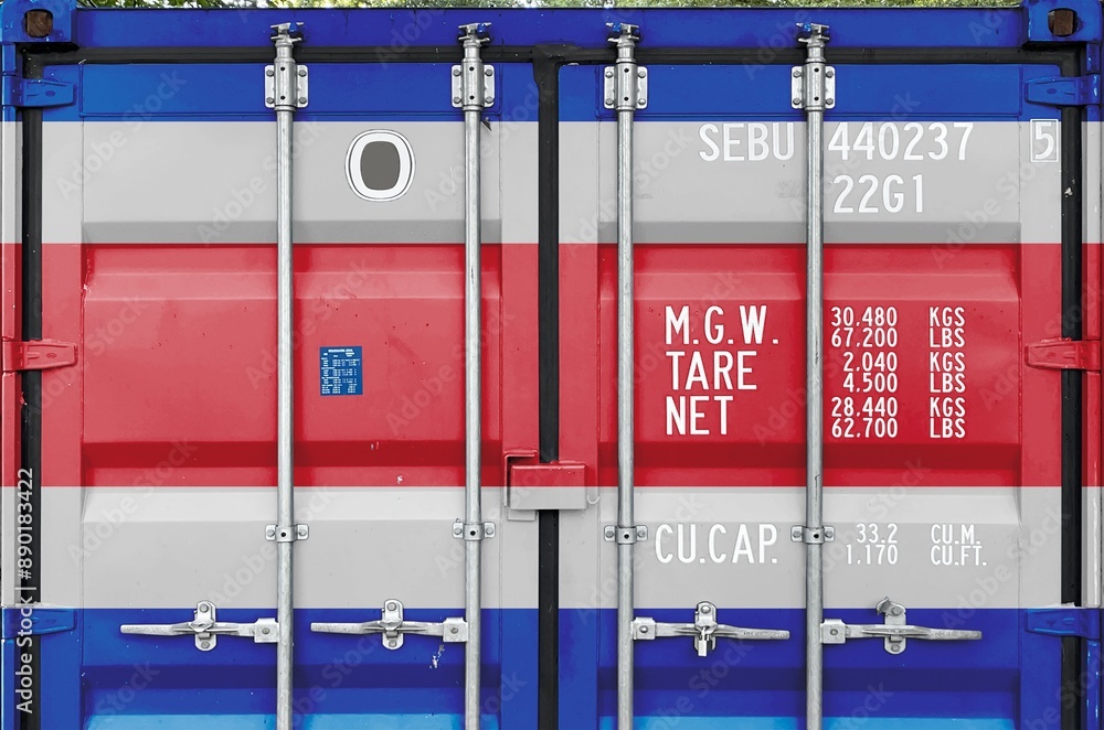 Costa Rica flag depicted on metal doors of shipping cargo container outdoors in docks area close up