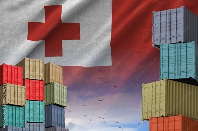 Tonga flag and big stack of shipping cargo containers in docks with sky background close up