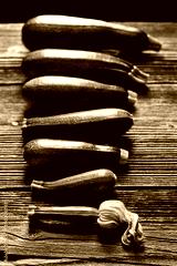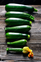 Zucchini laid out on a rustic wooden table in a row from small to large. Vegetable ripening concept. Aesthetic food photography