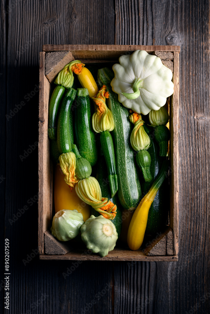 Wooden box with fresh different kind zucchini, pattypan squash and zucchini flowers on rustic table. Aesthetic food photography
