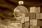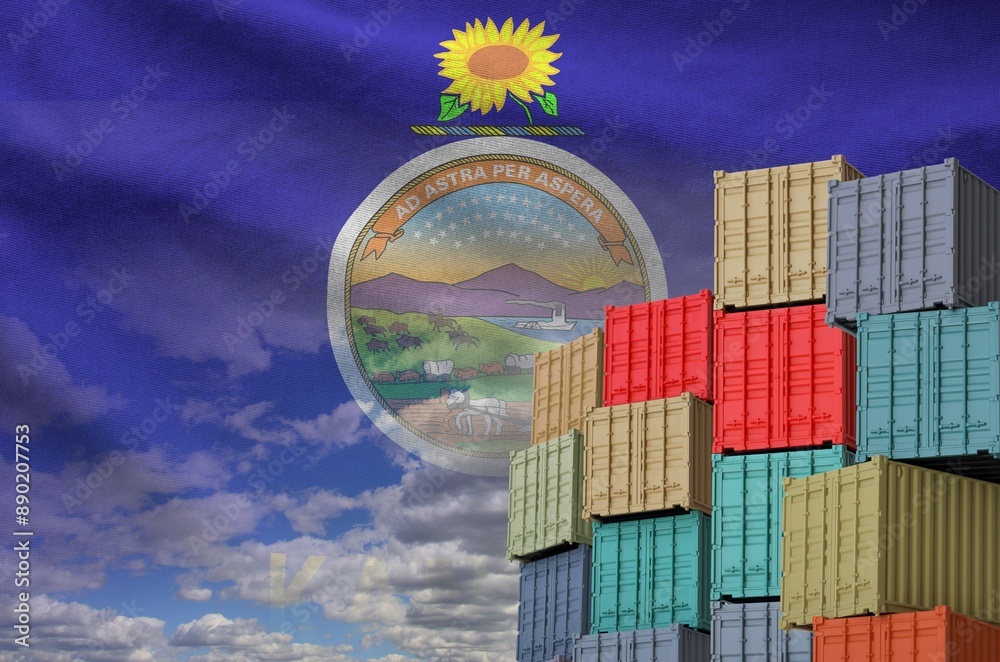 Kansas US state flag and big stack of shipping cargo containers in docks with sky background close up