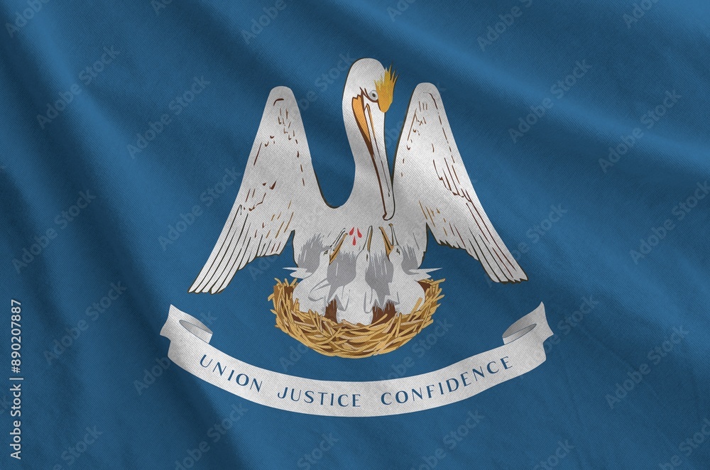 Louisiana US state flag depicted on folded wavy fabric of old cloth close up