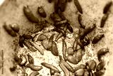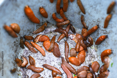 Orange Spanish slugs Arion vulgaris collected in a bucket from the garden. Control of garden pests