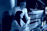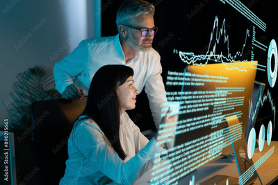 Business Professionals Analyzing Data On Futuristic Screen, Discussing Project Details In Modern Office, Highlighting Teamwork, Technology, And Innovation
