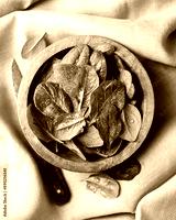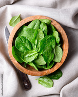 Heap of baby spinach leaves with water drops in a wooden bowl on linen tablecloth. Raw organic spinach greens close up