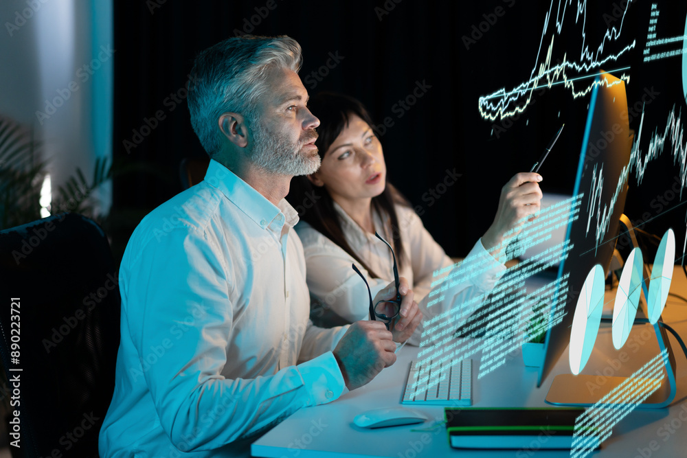Two Professionals Analyzing Data On Computer Screen, Focusing On Charts And Graphs, Discussing Business Strategies. Concept Of Technology, Data Analysis, Teamwork, And Modern Office Environment.