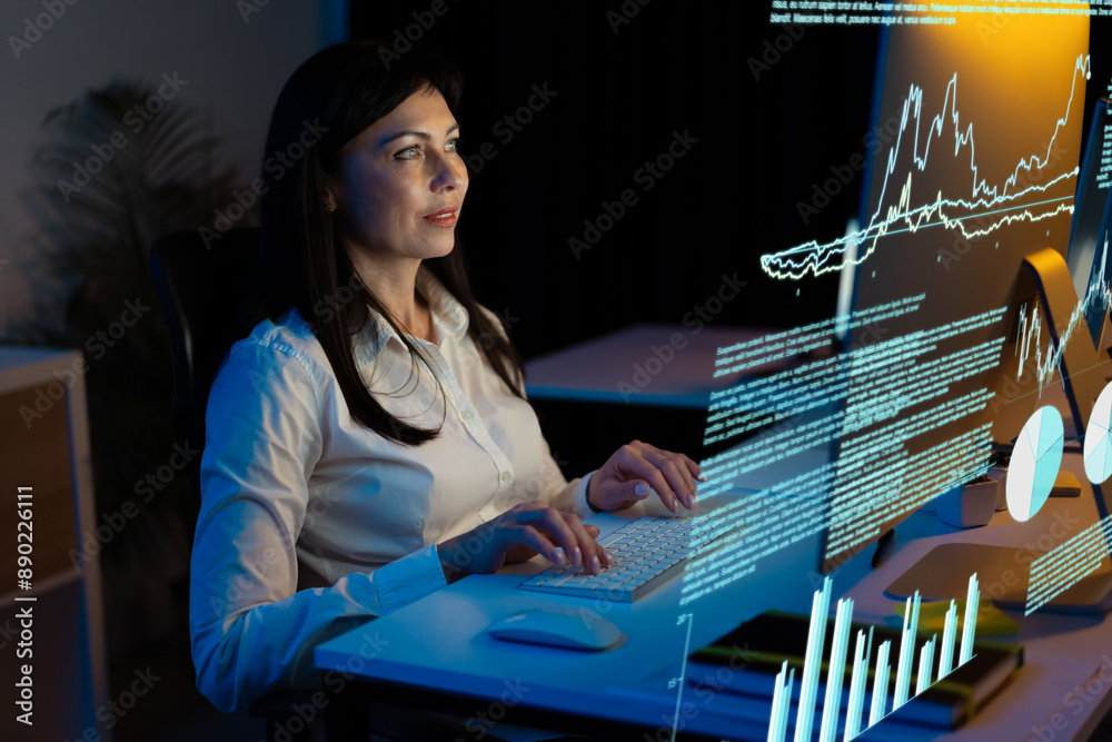Woman Analyzing Financial Data On Computer Screen, Demonstrating Focus And Professionalism In A Modern Office Environment.