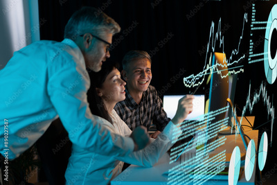 Team Of Professionals Analyzing Financial Data On Digital Screen, Illustrating Business Growth And Collaboration In Modern Office Environment