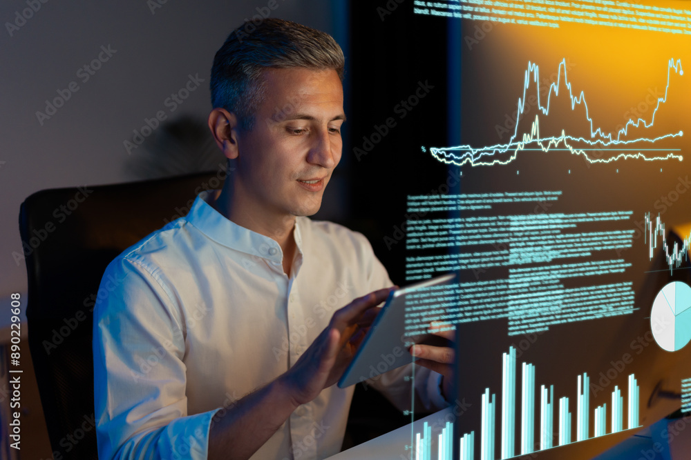 Business Professional Analyzing Data On Tablet And Interactive Screen, Reflecting Modern Technology And Innovation. Concept Of Digital Transformation, Business Analytics, And Data Visualization.