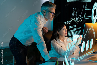 Two Business Professionals Analyzing Data On A High-Tech Computer Screen, Planning Strategies, And Reviewing Financial Charts In A Modern Office Environment