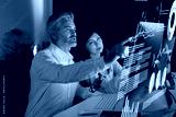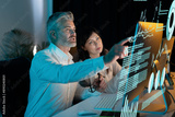 Business Professionals Analyzing Data on A Transparent Screen in A Modern Office Environment.