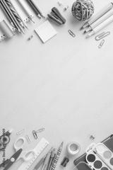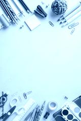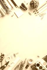 Top vertical view of assorted colorful school stationery on a pink background. Perfect for back to school or classroom themes
