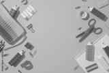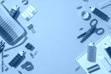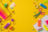 Top view of colorful school supplies including pens, scissors, glue, and notepads on a vibrant yellow background