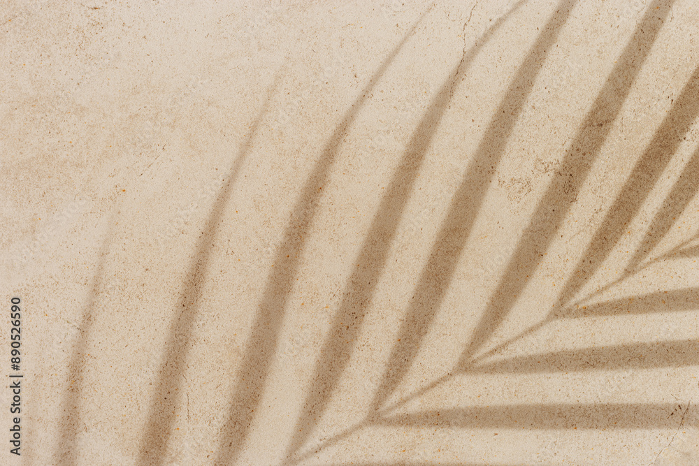 Summer background, top view sun shadow from palm leaf on sandy colored background. Summer aesthetic photo pale beige colored, copy space, nobody, vacation and rest concept. Abstract top view