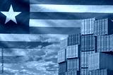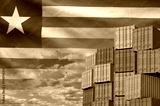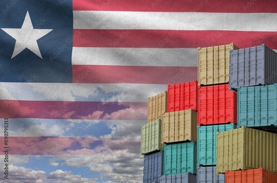 Liberia flag and big stack of shipping cargo containers in docks with sky background close up