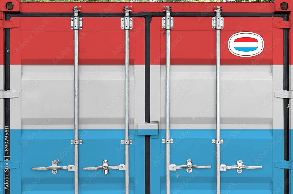 Luxembourg flag depicted on metal doors of shipping cargo container outdoors in docks area close up