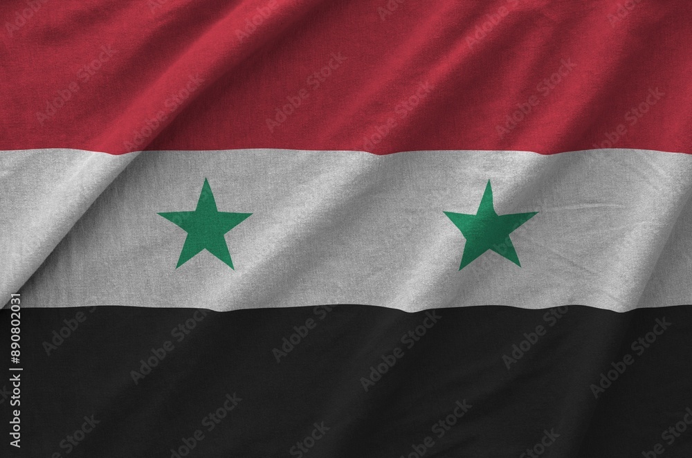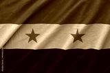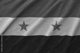 Syria flag depicted on folded wavy fabric of old cloth close up
