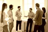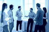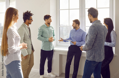 Diverse business team having a meeting with a team coach or a corporate manager. Group of young multiracial people standing in the office and talking about motivation and improving work results