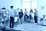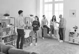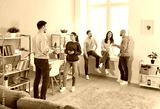 Company of cheerful smiling people friends or coworkers meeting in the living room together, talking and sharing news and stories with each other gathering at party at home. Friendship concept.