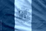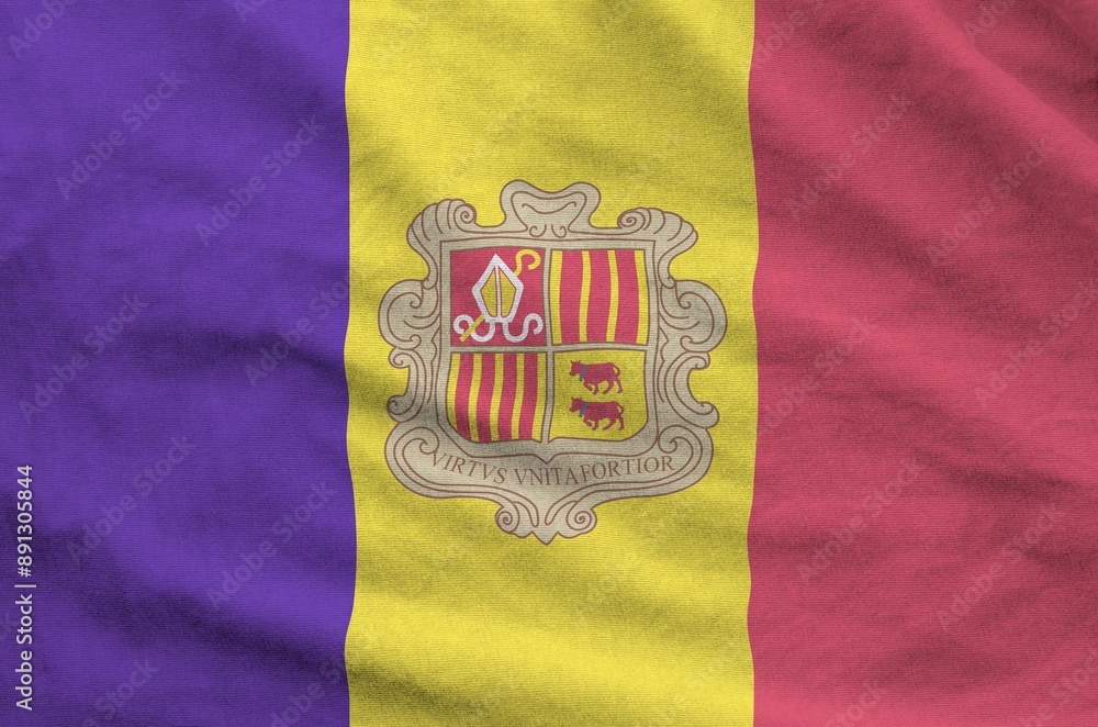 Andorra flag depicted on folded wavy fabric of old cloth close up