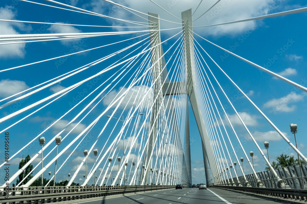 Beautiful suspension bridge with cars passing over it under a bright blue sky with white clouds. Wroclaw. Poland. High quality photo