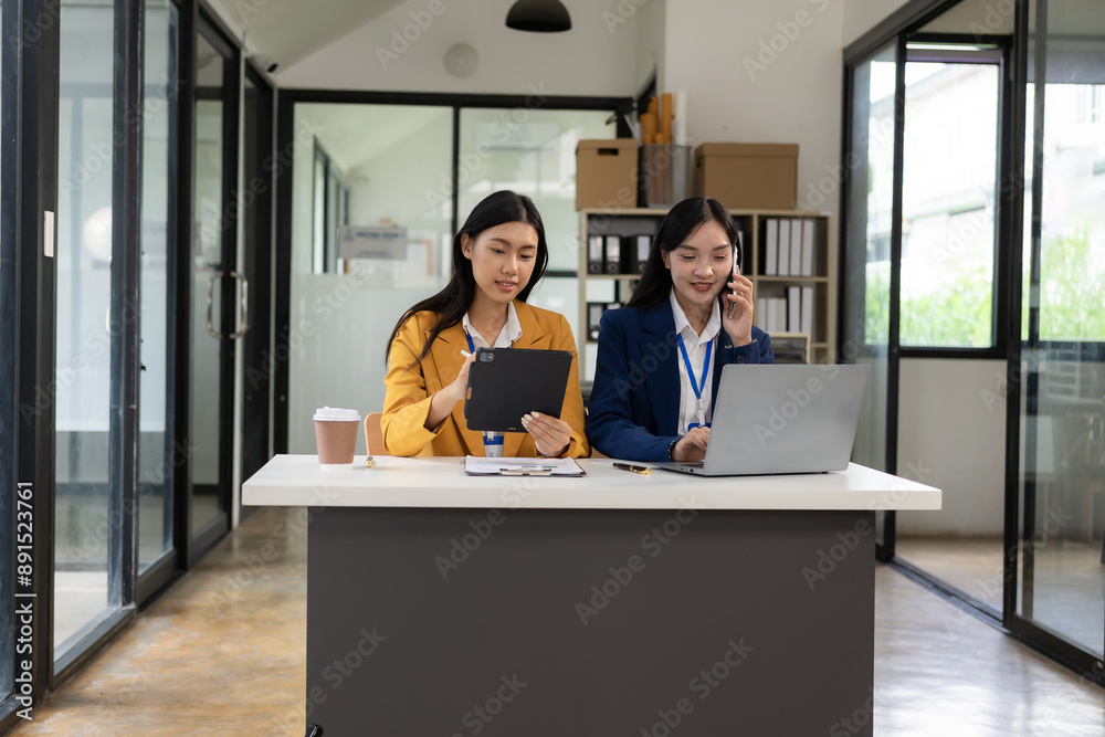 Two Asian businesswomen discuss pitching a new startup project idea. Analysis, planning and financial statistics, company business collaboration concept.
