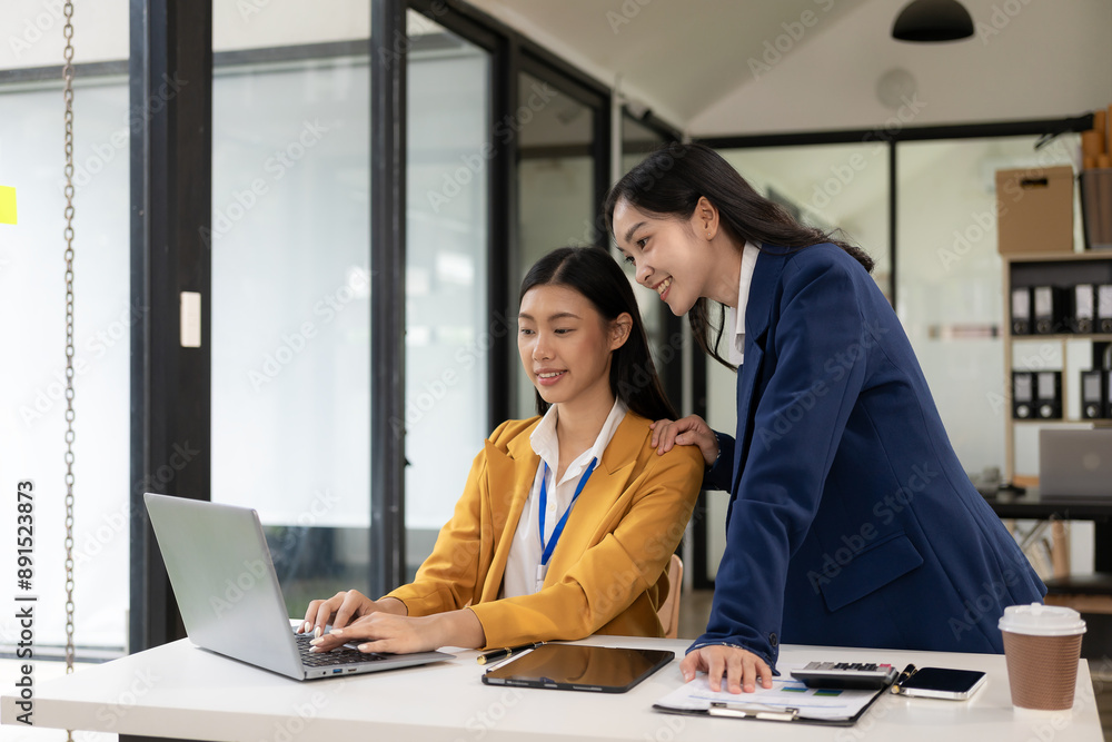 Two Asian businesswomen discuss pitching a new startup project idea. Analysis, planning and financial statistics, company business collaboration concept.