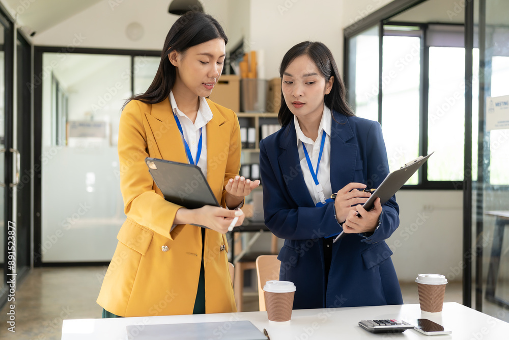 Two Asian businesswomen discuss pitching a new startup project idea. Analysis, planning and financial statistics, company business collaboration concept.