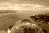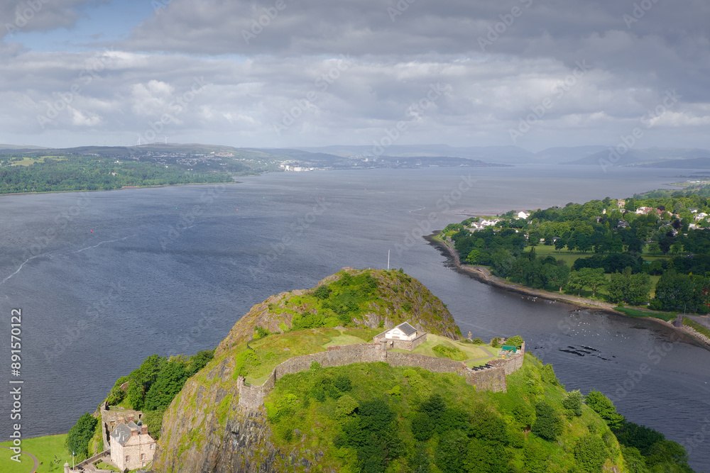 Dumbarton castle building on volcanic rock aerial view from above Scotland