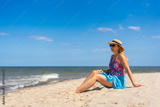 Summer holidays on the Baltic Sea. Beautiful young woman in a colorful swimsuit and a blue pareo and hat sitting on the ground on a sandy beach by the sea, looking dreamily at the horizon. Side view
