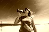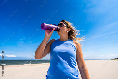 Drinking water in hot summer. Portrait of young modern woman with long blonde hair drinking water from water bottle on sandy beach on sunny day. Break from sports training to replenish water in body
