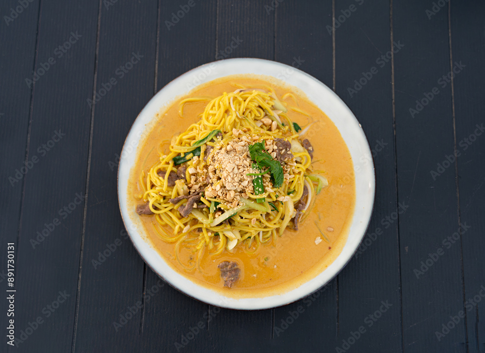 Chiang mai curry noodles, asian spicy egg pasta with meat, curried noodle soup Khao Soi or Khao Sawy, thai food