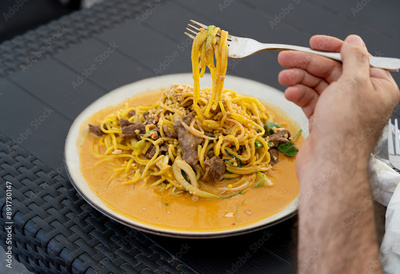 Chiang mai curry noodles, asian spicy egg pasta with meat, curried noodle soup Khao Soi or Khao Sawy, thai food