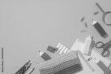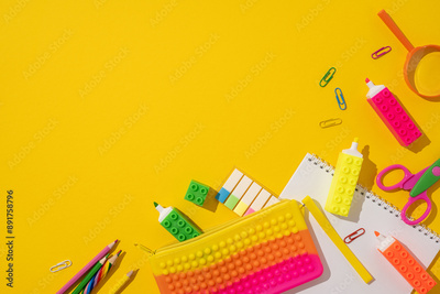 A vibrant arrangement of school supplies including pencils, scissors, glue, and paper clips on a yellow background