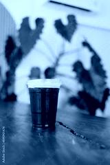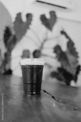 Iced fresh black coffee in a take away glass on wooden table in cozy cafe on background.