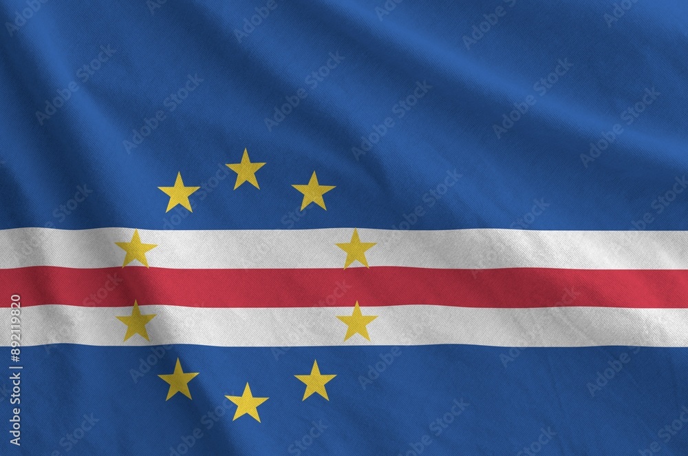 Cabo verde flag depicted on folded wavy fabric of old cloth close up