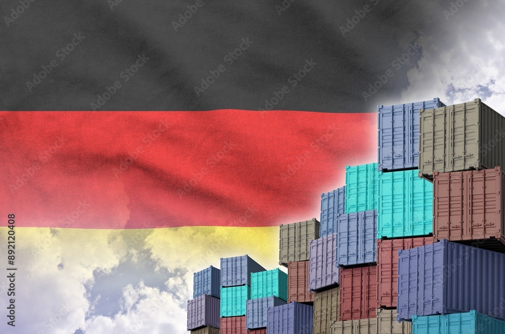 Germany flag and big stack of shipping cargo containers in docks with sky background close up