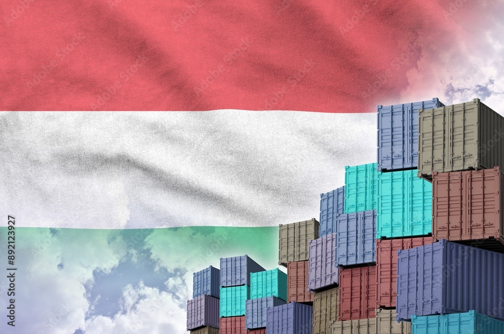 Hungary flag and big stack of shipping cargo containers in docks with sky background close up