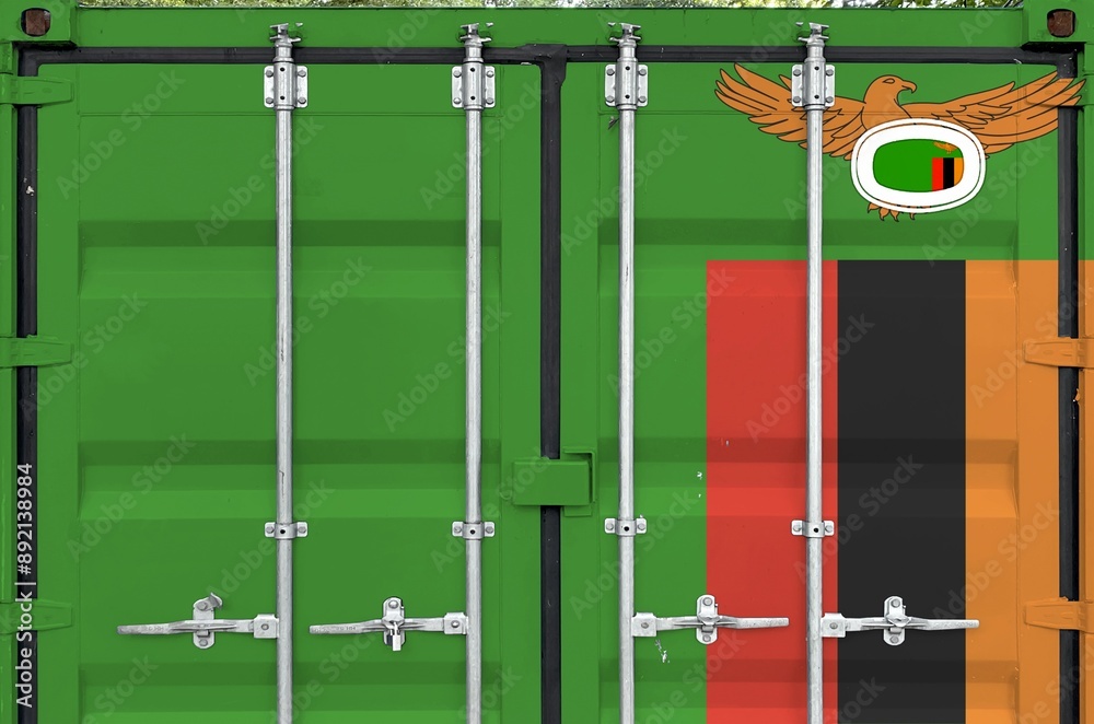 Zambia flag depicted on metal doors of shipping cargo container outdoors in docks area close up