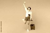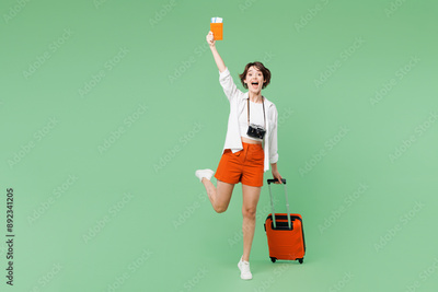 Full body happy traveler woman wears casual clothes hold passport ticket suitcase bag catch taxi isolated on plain green background. Tourist travel abroad in free time rest. Air flight trip concept.