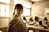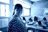 Cheerful portrait of a female primary school teacher looking at camera smiling and confident while being on a classroom with preteens studying at the background. Copy space image.